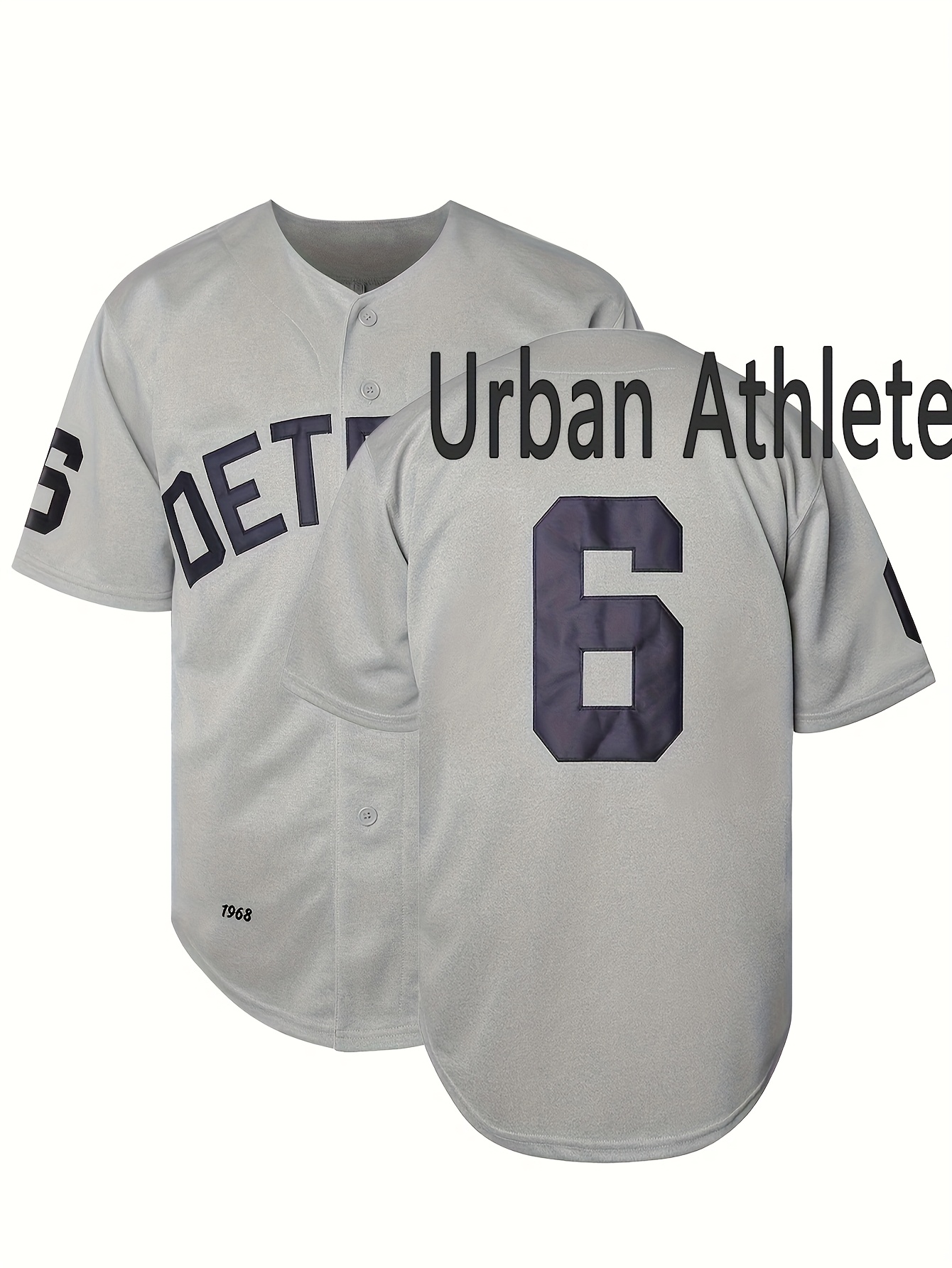Men's Detroit 6 Embroidered Baseball Jersey - V-Neck Short Sleeve Button-Up Shirt with Bold Lettering & Number 6 Design, Loose Fit Polyester Top for Training, Casual Wear & Sports (Sizes S-3XL)