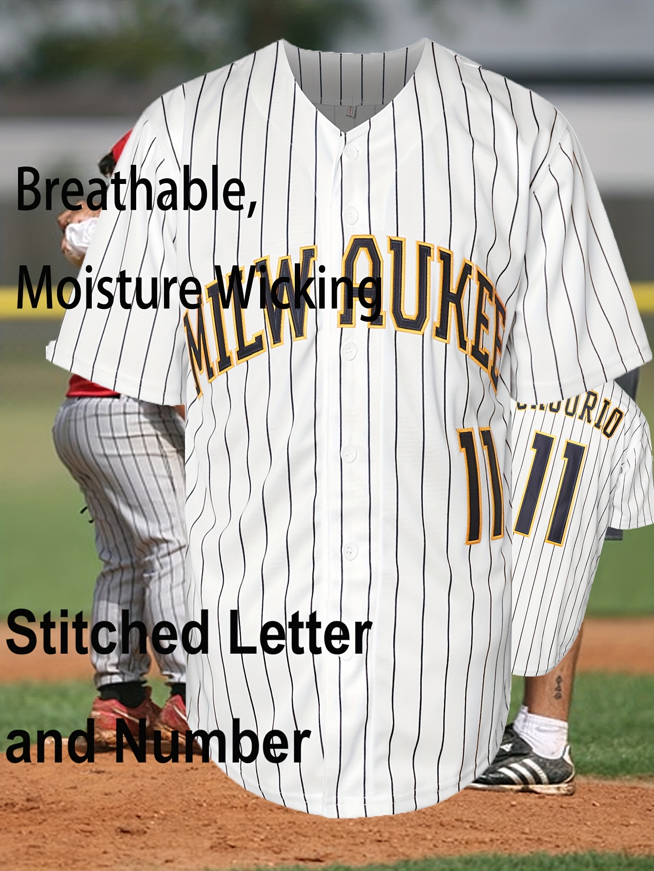 Men'S #11 Embroidered Striped Baseball Jersey - V-Neck, Button-Up, Breathable Polyester - Perfect for Sports & Outdoor Activities